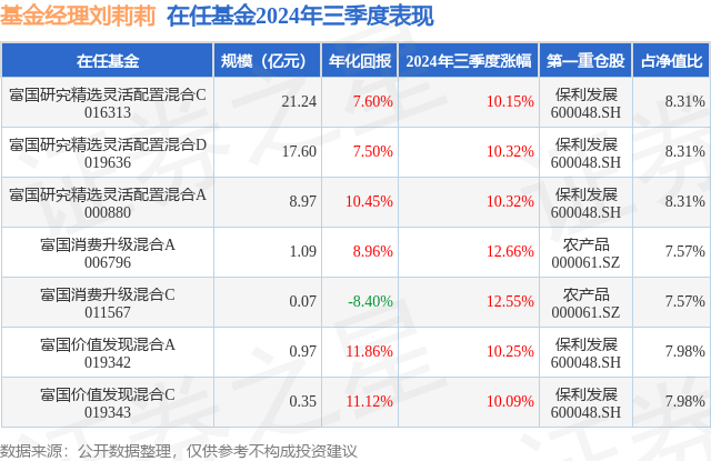 富国消费升级混合C现任基金经理为刘莉莉。其中在任基金经理刘莉莉已从业6年又110天,2024年4月3日正式接手管理富国消费升级混合C,任职期间累计回报为5.1%。目前还管理着7只基金产品(包括A类和C类),其中本季度表现最佳的基金为富国消费升级混合A(006796),季度净值涨幅为12.66%。