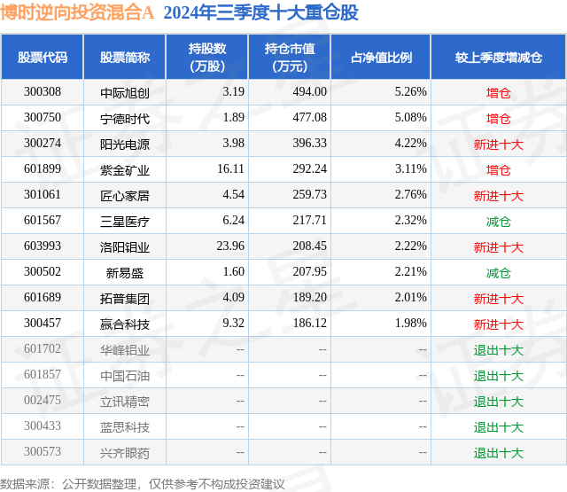 从基金规模来看,博时逆向投资混合A基金2024年三季度公布的基金规模为0.59亿元,较上一期规模5726.15万元变化了163.34万元,环比变化了2.85%。该基金最新一期资产配置为:股票占净值比89.14%,无债券类资产,现金占净值比17.32%。从基金持仓来看,该基金当季前十大股票仓位达31.17%,第一大重仓股为中际旭创(300308),持仓占比为5.26%。
