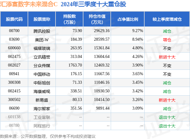 从基金规模来看,汇添富数字未来混合C基金2024年三季度公布的基金规模为4.05亿元,较上一期规模3.75亿元变化了3055.55万元,环比变化了8.15%。该基金最新一期资产配置为:股票占净值比86.69%,债券占净值比1.58%,现金占净值比11.83%。从基金持仓来看,该基金当季前十大股票仓位达48.04%,第一大重仓股为腾讯控股(00700),持仓占比为9.27%。