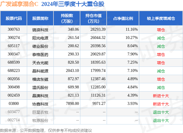 从基金规模来看,广发诚享混合C基金2024年三季度公布的基金规模为2.43亿元,较上一期规模2.02亿元变化了4132.25万元,环比变化了20.44%。该基金最新一期资产配置为:股票占净值比87.5%,债券占净值比0.24%,现金占净值比12.38%。从基金持仓来看,该基金当季前十大股票仓位达69.77%,第一大重仓股为锦浪科技(300763),持仓占比为11.16%。