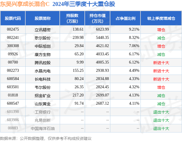 从基金规模来看,东吴兴享成长混合C基金2024年三季度公布的基金规模为1.32亿元,较上一期规模5976.97万元变化了7198.72万元,环比变化了120.44%。该基金最新一期资产配置为:股票占净值比85.54%,无债券类资产,现金占净值比19.48%。从基金持仓来看,该基金当季前十大股票仓位达58.26%,第一大重仓股为立讯精密(002475),持仓占比为9.21%。
