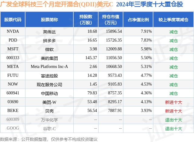 从基金规模来看,广发全球科技三个月定开混合(QDII)美元C基金2024年三季度公布的基金规模为4.11亿元,较上一期规模4.47亿元变化了-3635.71万元,环比变化了-8.13%。该基金最新一期资产配置为:股票占净值比66.25%,无债券类资产,现金占净值比16.7%。从基金持仓来看,该基金当季前十大股票仓位达54.25%,第一大重仓股为英伟达(NVDA),持仓占比为7.91%。