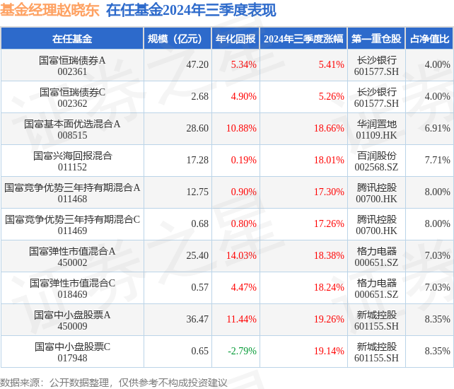 证券之星消息,日前国富竞争优势三年持有期混合A基金公布三季报,2024年三季度最新规模12.75亿元,季度净值涨幅为17.3%。