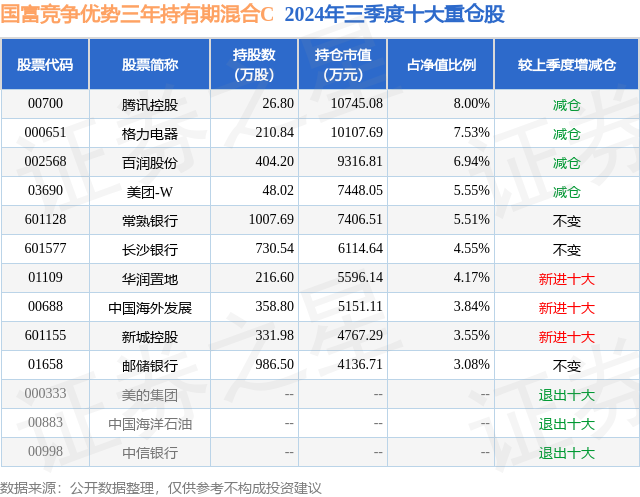 从基金规模来看,国富竞争优势三年持有期混合C基金2024年三季度公布的基金规模为0.68亿元,较上一期规模6324.13万元变化了450.97万元,环比变化了7.13%。该基金最新一期资产配置为:股票占净值比89.21%,债券占净值比5.33%,现金占净值比5.43%。从基金持仓来看,该基金当季前十大股票仓位达52.72%,第一大重仓股为腾讯控股(00700),持仓占比为8.0%。