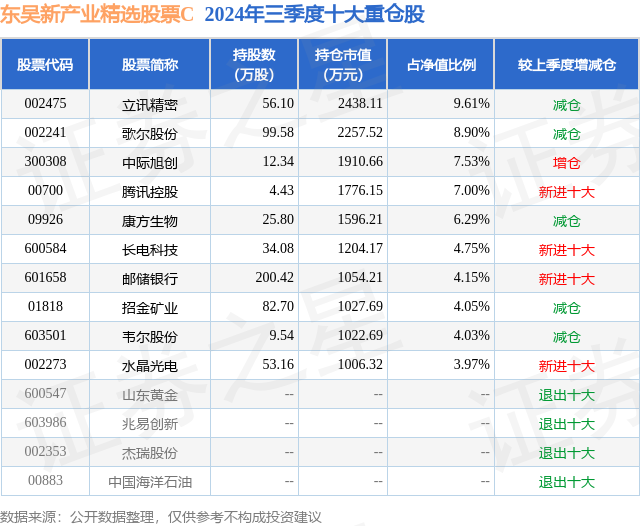 从基金规模来看,东吴新产业精选股票C基金2024年三季度公布的基金规模为1.21亿元,较上一期规模1.42亿元变化了-2162.06万元,环比变化了-15.2%。该基金最新一期资产配置为:股票占净值比89.19%,无债券类资产,现金占净值比9.99%。从基金持仓来看,该基金当季前十大股票仓位达60.28%,第一大重仓股为立讯精密(002475),持仓占比为9.61%。