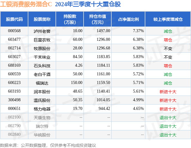 从基金规模来看,工银消费服务混合C基金2024年三季度公布的基金规模为0.04亿元,较上一期规模243.36万元变化了107.24万元,环比变化了44.07%。该基金最新一期资产配置为:股票占净值比94.59%,无债券类资产,现金占净值比5.12%。从基金持仓来看,该基金当季前十大股票仓位达58.47%,第一大重仓股为泸州老窖(000568),持仓占比为7.37%。