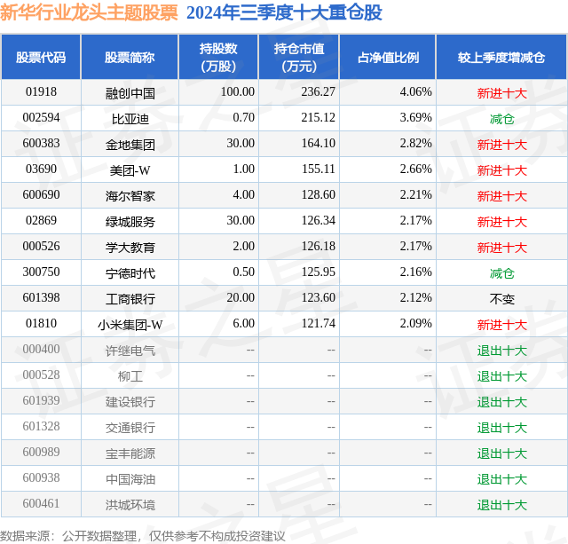 从基金规模来看,新华行业龙头主题股票基金2024年三季度公布的基金规模为0.58亿元,较上一期规模5186.77万元变化了636.37万元,环比变化了12.27%。该基金最新一期资产配置为:股票占净值比90.09%,债券占净值比4.74%,现金占净值比3.48%。从基金持仓来看,该基金当季前十大股票仓位达26.15%,第一大重仓股为融创中国(01918),持仓占比为4.06%。