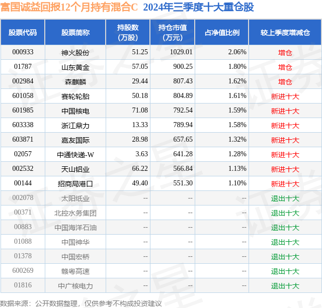 从基金规模来看,富国诚益回报12个月持有混合C基金2024年三季度公布的基金规模为2.34亿元,较上一期规模2.81亿元变化了-4741.74万元,环比变化了-16.86%。该基金最新一期资产配置为:股票占净值比34.7%,债券占净值比51.99%,现金占净值比3.01%。从基金持仓来看,该基金当季前十大股票仓位达15.09%,第一大重仓股为神火股份(000933),持仓占比为2.06%。