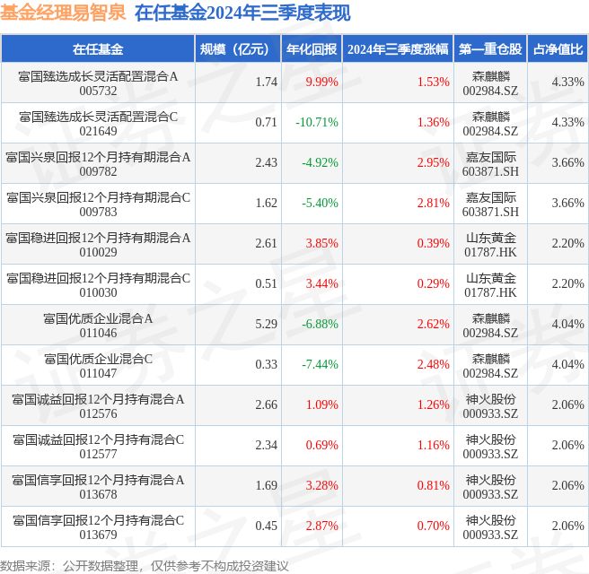 富国诚益回报12个月持有混合C现任基金经理为易智泉 朱梦娜,本季度增聘基金经理朱梦娜,近期离任的基金经理为张士扬。其中在任基金经理易智泉已从业7年又12天,2021年8月20日正式接手管理富国诚益回报12个月持有混合C,任职期间累计回报为2.2%。目前还管理着12只基金产品(包括A类和C类),其中本季度表现最佳的基金为富国兴泉回报12个月持有期混合A(009782),季度净值涨幅为2.95%。