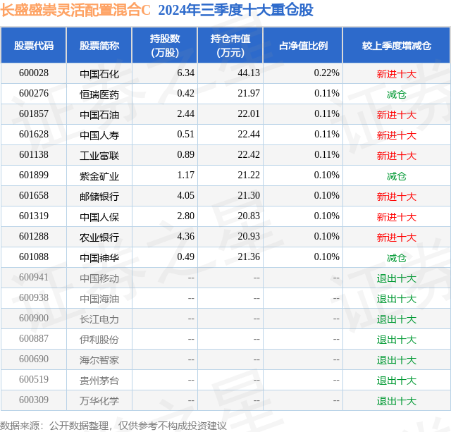 从基金规模来看,长盛盛崇灵活配置混合C基金2024年三季度公布的基金规模为0.02亿元,较上一期规模6224.39万元变化了-6011.88万元,环比变化了-96.59%。该基金最新一期资产配置为:股票占净值比1.25%,债券占净值比78.48%,现金占净值比1.81%。从基金持仓来看,该基金当季前十大股票仓位达1.16%,第一大重仓股为中国石化(600028),持仓占比为0.22%。