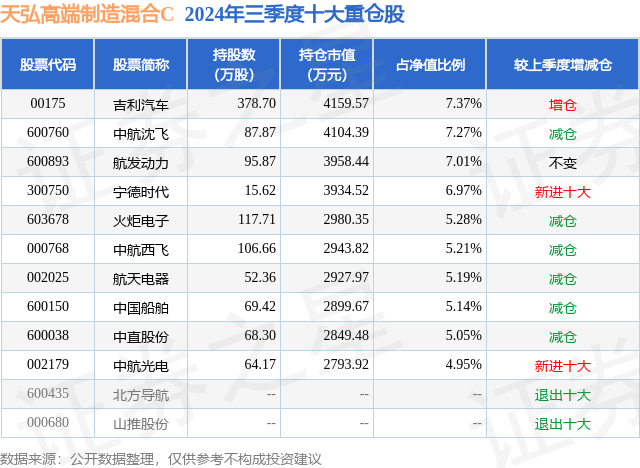 从基金规模来看,天弘高端制造混合C基金2024年三季度公布的基金规模为1.17亿元,较上一期规模1.06亿元变化了1097.41万元,环比变化了10.32%。该基金最新一期资产配置为:股票占净值比93.04%,无债券类资产,现金占净值比7.1%。从基金持仓来看,该基金当季前十大股票仓位达59.44%,第一大重仓股为吉利汽车(00175),持仓占比为7.37%。