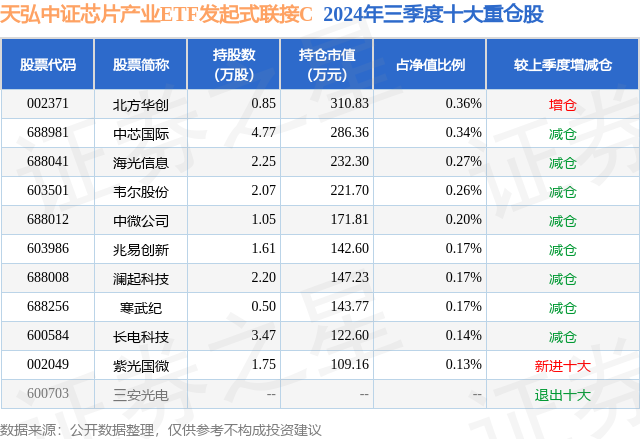 从基金规模来看,天弘中证芯片产业ETF发起式联接C基金2024年三季度公布的基金规模为6.93亿元,较上一期规模4.97亿元变化了1.96亿元,环比变化了39.48%。该基金最新一期资产配置为:股票占净值比4.12%,无债券类资产,现金占净值比5.75%。从基金持仓来看,该基金当季前十大股票仓位达2.21%,第一大重仓股为北方华创(002371),持仓占比为0.36%。