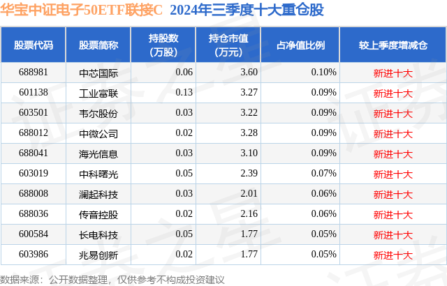 从基金规模来看,华宝中证电子50ETF联接C基金2024年三季度公布的基金规模为0.08亿元,较上一期规模641.1万元变化了185.02万元,环比变化了28.86%。该基金最新一期资产配置为:股票占净值比0.93%,无债券类资产,现金占净值比5.34%。从基金持仓来看,该基金当季前十大股票仓位达0.75%,第一大重仓股为中芯国际(688981),持仓占比为0.1%。