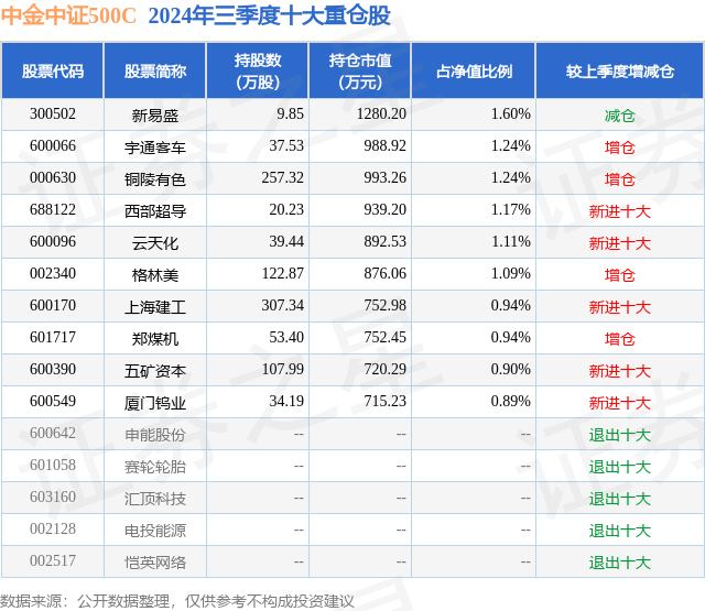 从基金规模来看,中金中证500C基金2024年三季度公布的基金规模为2.53亿元,较上一期规模2.03亿元变化了5061.59万元,环比变化了24.98%。该基金最新一期资产配置为:股票占净值比94.09%,债券占净值比5.32%,现金占净值比0.93%。从基金持仓来看,该基金当季前十大股票仓位达11.12%,第一大重仓股为新易盛(300502),持仓占比为1.6%。