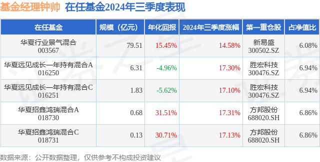 证券之星消息,日前华夏行业景气混合基金公布三季报,2024年三季度最新规模79.51亿元,季度净值涨幅为14.58%。