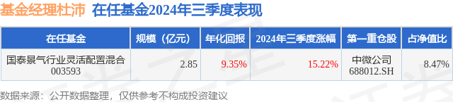 从基金规模来看,国泰景气行业灵活配置混合基金2024年三季度公布的基金规模为2.85亿元,较上一期规模2.52亿元变化了3247.89万元,环比变化了12.89%。该基金最新一期资产配置为:股票占净值比92.93%,债券占净值比4.97%,现金占净值比1.41%。从基金持仓来看,该基金当季前十大股票仓位达67.88%,第一大重仓股为中微公司(688012),持仓占比为8.47%。