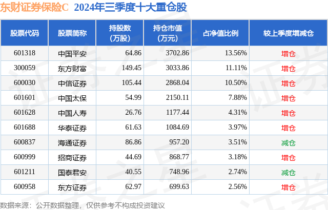 从基金规模来看,东财证券保险C基金2024年三季度公布的基金规模为1.57亿元,较上一期规模7606.6万元变化了8050.48万元,环比变化了105.84%。该基金最新一期资产配置为:股票占净值比89.6%,无债券类资产,现金占净值比7.82%。从基金持仓来看,该基金当季前十大股票仓位达63.32%,第一大重仓股为中国平安(601318),持仓占比为13.56%。