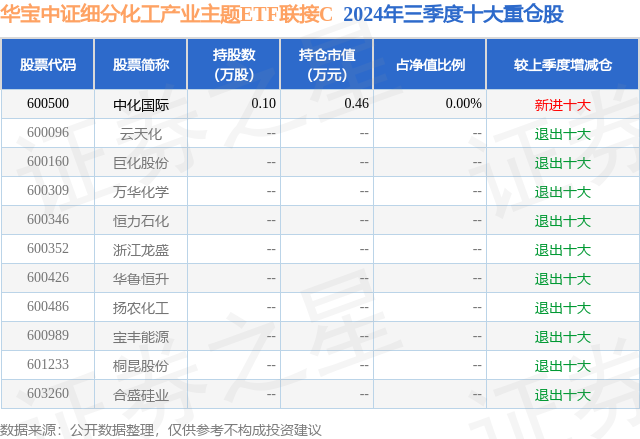 从基金规模来看,华宝中证细分化工产业主题ETF联接C基金2024年三季度公布的基金规模为1.38亿元,较上一期规模1.29亿元变化了914.47万元,环比变化了7.1%。该基金最新一期资产配置为:无股票类资产,无债券类资产,现金占净值比5.5%。从基金持仓来看,该基金当季前十大股票仓位达0.0%,第一大重仓股为中化国际(600500),持仓占比为0.0%。