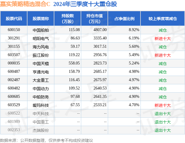 从基金规模来看,嘉实策略精选混合C基金2024年三季度公布的基金规模为0.29亿元,较上一期规模2722.1万元变化了164.24万元,环比变化了6.03%。该基金最新一期资产配置为:股票占净值比94.68%,债券占净值比4.3%,现金占净值比1.2%。从基金持仓来看,该基金当季前十大股票仓位达55.89%,第一大重仓股为中国船舶(600150),持仓占比为8.92%。