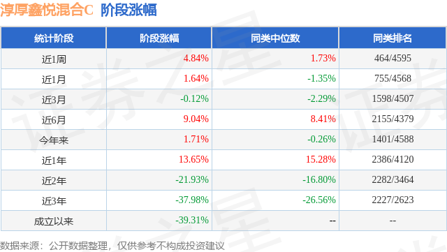 从业绩表现来看,淳厚鑫悦混合C基金过去一年净值涨幅为5.75%,在同类基金中排名1877/3979,同类基金过去一年净值涨幅中位数为5.4%。而基金过去一年的最大回撤为-23.13%,成立以来的最大回撤为-52.7%。