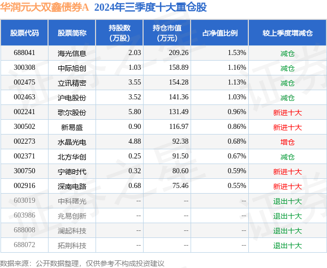 从基金规模来看,华润元大双鑫债券A基金2024年三季度公布的基金规模为0.03亿元,较上一期规模312.58万元变化了5.23万元,环比变化了1.67%。该基金最新一期资产配置为:股票占净值比15.32%,债券占净值比97.52%,现金占净值比0.66%。从基金持仓来看,该基金当季前十大股票仓位达9.16%,第一大重仓股为海光信息(688041),持仓占比为1.53%。