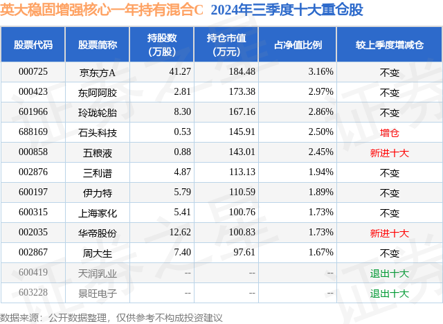 从基金规模来看,英大稳固增强核心一年持有混合C基金2024年三季度公布的基金规模为0.36亿元,较上一期规模3633.64万元变化了-61.08万元,环比变化了-1.68%。该基金最新一期资产配置为:股票占净值比33.16%,债券占净值比53.25%,现金占净值比3.63%。从基金持仓来看,该基金当季前十大股票仓位达22.9%,第一大重仓股为京东方A(000725),持仓占比为3.16%。