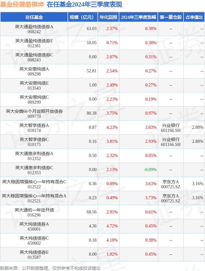 英大稳固增强核心一年持有混合C现任基金经理为易祺坤 张大铮。其中在任基金经理易祺坤已从业7年又241天,2021年12月14日正式接手管理英大稳固增强核心一年持有混合C,任职期间累计回报为0.27%。目前还管理着17只基金产品(包括A类和C类),其中本季度表现最佳的基金为英大稳固增强核心一年持有混合A(012521),季度净值涨幅为3.73%。