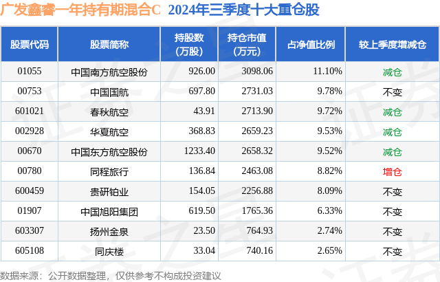 从基金规模来看,广发鑫睿一年持有期混合C基金2024年三季度公布的基金规模为0.88亿元,较上一期规模8095.08万元变化了671.69万元,环比变化了8.3%。该基金最新一期资产配置为:股票占净值比94.68%,债券占净值比0.33%,现金占净值比4.82%。从基金持仓来看,该基金当季前十大股票仓位达78.28%,第一大重仓股为中国南方航空股份(01055),持仓占比为11.1%。