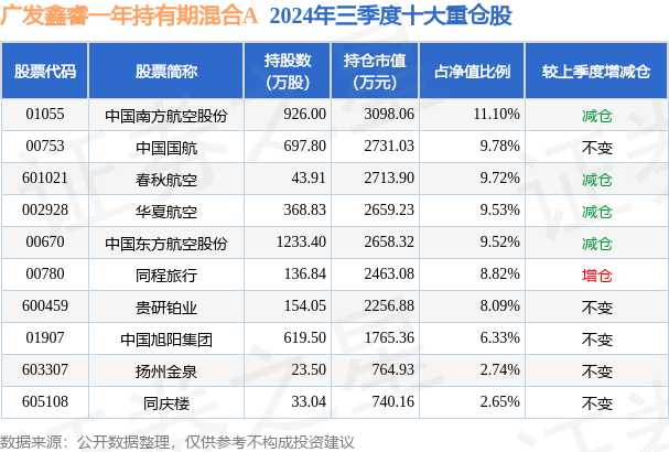 从基金规模来看,广发鑫睿一年持有期混合A基金2024年三季度公布的基金规模为1.91亿元,较上一期规模1.77亿元变化了1487.98万元,环比变化了8.43%。该基金最新一期资产配置为:股票占净值比94.68%,债券占净值比0.33%,现金占净值比4.82%。从基金持仓来看,该基金当季前十大股票仓位达78.28%,第一大重仓股为中国南方航空股份(01055),持仓占比为11.1%。