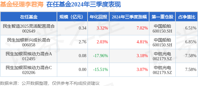 从基金规模来看,民生加银双核动力混合A基金2024年三季度公布的基金规模为0.08亿元,较上一期规模805.86万元变化了9.72万元,环比变化了1.21%。该基金最新一期资产配置为:股票占净值比66.73%,无债券类资产,现金占净值比33.79%。从基金持仓来看,该基金当季前十大股票仓位达50.93%,第一大重仓股为中航光电(002179),持仓占比为7.58%。
