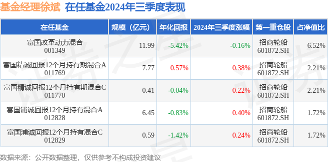 从基金规模来看,富国浦诚回报12个月持有混合C基金2024年三季度公布的基金规模为0.59亿元,较上一期规模6232.73万元变化了-333.96万元,环比变化了-5.36%。该基金最新一期资产配置为:股票占净值比25.21%,债券占净值比49.36%,现金占净值比19.13%。从基金持仓来看,该基金当季前十大股票仓位达10.64%,第一大重仓股为招商轮船(601872),持仓占比为1.72%。