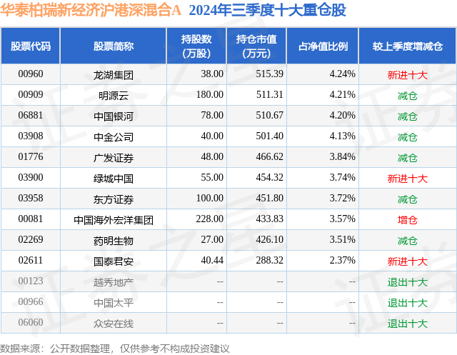 从基金规模来看,华泰柏瑞新经济沪港深混合A基金2024年三季度公布的基金规模为1.03亿元,较上一期规模7168.62万元变化了3163.29万元,环比变化了44.13%。该基金最新一期资产配置为:股票占净值比68.98%,债券占净值比0.5%,现金占净值比6.8%。从基金持仓来看,该基金当季前十大股票仓位达37.53%,第一大重仓股为龙湖集团(00960),持仓占比为4.24%。