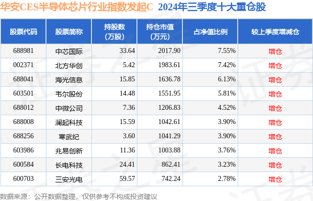 从基金规模来看,华安CES半导体芯片行业指数发起C基金2024年三季度公布的基金规模为1.77亿元,较上一期规模1.26亿元变化了5062.91万元,环比变化了40.2%。该基金最新一期资产配置为:股票占净值比92.64%,无债券类资产,现金占净值比5.71%。从基金持仓来看,该基金当季前十大股票仓位达49.0%,第一大重仓股为中芯国际(688981),持仓占比为7.55%。