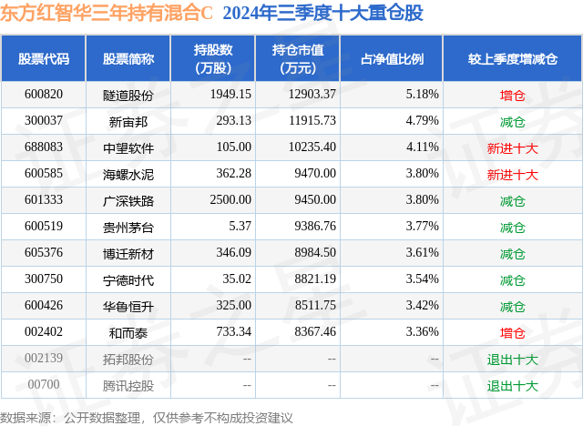 从基金规模来看,东方红智华三年持有混合C基金2024年三季度公布的基金规模为0.55亿元,较上一期规模5938.72万元变化了-460.21万元,环比变化了-7.75%。该基金最新一期资产配置为:股票占净值比80.68%,债券占净值比1.44%,现金占净值比17.62%。从基金持仓来看,该基金当季前十大股票仓位达39.38%,第一大重仓股为隧道股份(600820),持仓占比为5.18%。