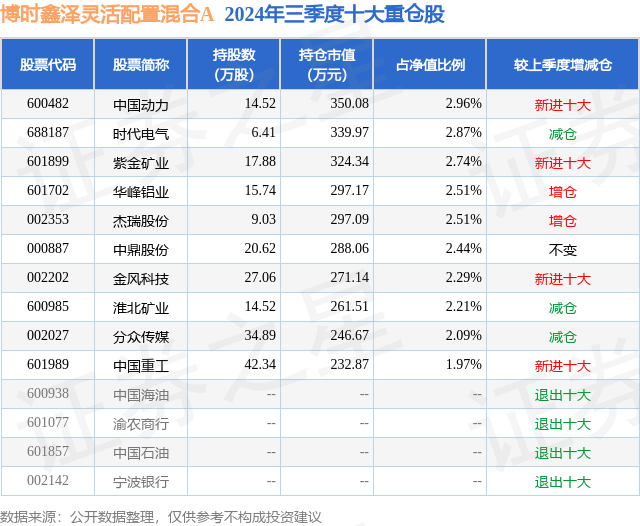 从基金规模来看,博时鑫泽灵活配置混合A基金2024年三季度公布的基金规模为1.15亿元,较上一期规模1.18亿元变化了-338.43万元,环比变化了-2.87%。该基金最新一期资产配置为:股票占净值比59.36%,无债券类资产,现金占净值比22.31%。从基金持仓来看,该基金当季前十大股票仓位达24.59%,第一大重仓股为中国动力(600482),持仓占比为2.96%。