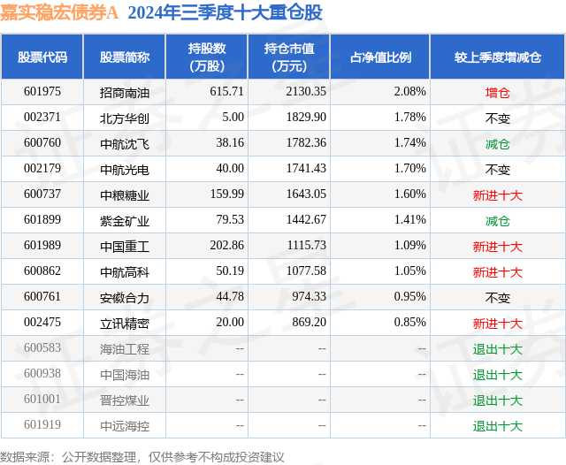从基金规模来看,嘉实稳宏债券A基金2024年三季度公布的基金规模为6.63亿元,较上一期规模9.33亿元变化了-2.7亿元,环比变化了-28.97%。该基金最新一期资产配置为:股票占净值比23.45%,债券占净值比92.82%,现金占净值比1.38%。从基金持仓来看,该基金当季前十大股票仓位达14.25%,第一大重仓股为招商南油(601975),持仓占比为2.08%。