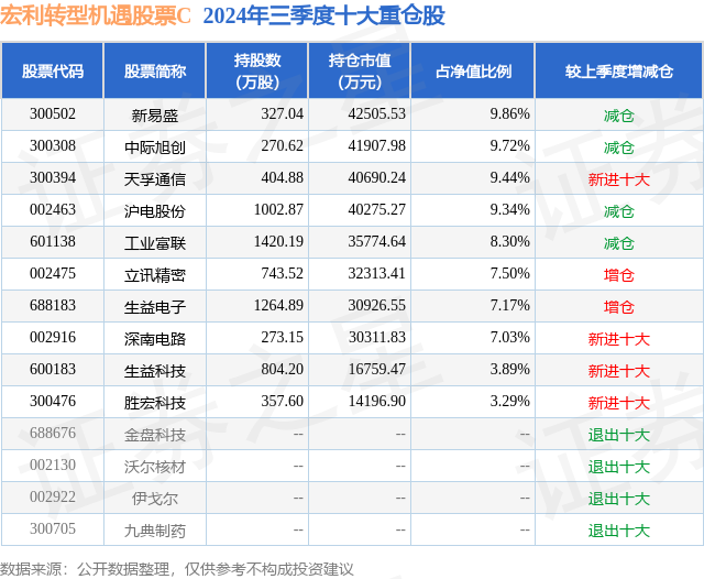 从基金规模来看,宏利转型机遇股票C基金2024年三季度公布的基金规模为5.85亿元,较上一期规模7.04亿元变化了-1.18亿元,环比变化了-16.79%。该基金最新一期资产配置为:股票占净值比94.38%,债券占净值比4.46%,现金占净值比1.38%。从基金持仓来看,该基金当季前十大股票仓位达75.54%,第一大重仓股为新易盛(300502),持仓占比为9.86%。