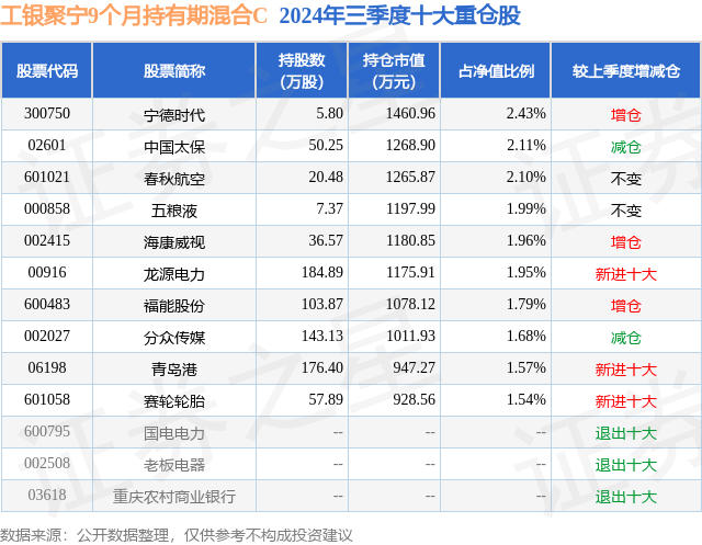 从基金规模来看,工银聚宁9个月持有期混合C基金2024年三季度公布的基金规模为0.19亿元,较上一期规模1929.38万元变化了9.03万元,环比变化了0.47%。该基金最新一期资产配置为:股票占净值比32.34%,债券占净值比78.05%,现金占净值比2.46%。从基金持仓来看,该基金当季前十大股票仓位达19.12%,第一大重仓股为宁德时代(300750),持仓占比为2.43%。
