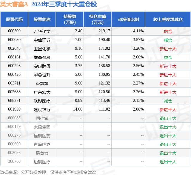 从基金规模来看,英大睿鑫A基金2024年三季度公布的基金规模为0.52亿元,较上一期规模4528.17万元变化了624.78万元,环比变化了13.8%。该基金最新一期资产配置为:股票占净值比93.07%,无债券类资产,现金占净值比6.46%。从基金持仓来看,该基金当季前十大股票仓位达27.29%,第一大重仓股为万华化学(600309),持仓占比为4.11%。