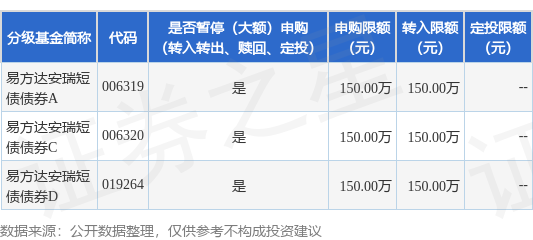 注:(1)根据法律法规和基金合同的相关规定,易方达基金管理有限公司(以下简称“本公司”)决定自2024年11月19日起暂停易方达安瑞短债债券型证券投资基金(以下简称“本基金”)机构客户在全部销售机构A类基金份额、C类基金份额和D类基金份额的大额申购、大额转换转入业务,单日单个基金账户在全部销售机构累计申购(含定期定额投资及转换转入,下同)本基金A类基金份额或C类基金份额或D类基金份额的金额不超过150万元(含)。如单日单个基金账户单笔申购本基金A类基金份额或C类基金份额或D类基金份额的金额超过150万元(不含),则150万元确认申购成功,超过150万元(不含)金额的部分将确认失败;如单日单个基金账户多笔累计申购本基金A类基金份额的金额超过150万元(不含)或单日单个基金账户多笔累计申购本基金C类基金份额的金额超过150万元(不含)或单日单个基金账户多笔累计申购本基金D类基金份额的金额超过150万元(不含),则对该类基金份额的申请按照申请金额从大到小排序,基金管理人将逐笔累加至该类基金份额不超过150万元(含)限额的申请确认成功,该类基金份额其余申请金额确认失败。
