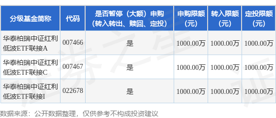 证券之星消息,12月4日华泰柏瑞基金管理有限公司发布《华泰柏瑞中证红利低波动交易型开放式指数证券投资基金联接基金暂停大额申购(含转换转入、定期定额投资)业务的公告》。公告中提示,为保证本基金的稳定运作,保护基金份额持有人利益,自2024年12月4日起华泰柏瑞中证红利低波动交易型开放式指数证券投资基金联接基金暂停大额申购(含转换转入、定期定额投资)业务,申购、转换转入上限金额为1000.0万元,下属分级基金调整明细如下: