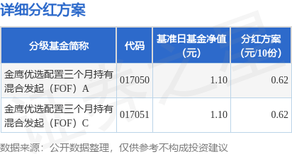 证券之星消息,12月18日发布《金鹰优选配置三个月持有期混合型发起式基金中基金(FOF)分红公告》。本次分红为2024年第一次分红。公告显示,本次分红的收益分配基准日为12月12日,详细分红方案如下: