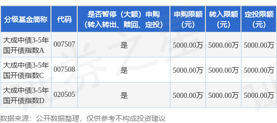 证券之星消息,12月18日大成基金管理有限公司发布《关于大成中债3-5年国开行债券指数证券投资基金暂停大额申购(含定期定额申购)及转换转入业务的公告》。公告中提示,为维护基金份额持有人利益,保障基金的平稳运作,自2024年12月19日起大成中债3-5年国开行债券指数证券投资基金暂停大额申购(含定期定额申购)及转换转入业务,申购、转换转入上限金额为5000.0万元,下属分级基金调整明细如下: