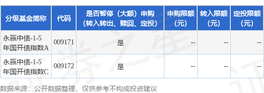 证券之星消息,12月18日永赢基金管理有限公司发布《永赢中债-1-5年国开行债券指数证券投资基金暂停机构投资者大额申购(含定期定额投资)、转换转入业务的公告》。公告中提示,为保障基金平稳运作,根据《永赢中债-1-5年国开行债券指数证券投资基金基金合同》的有关规定,自2024年12月18日起永赢中债-1-5年国开行债券指数证券投资基金暂停机构投资者大额申购(含定期定额投资)、转换转入业务,申购、转换转入上限金额为500.0万元,下属分级基金调整明细如下: