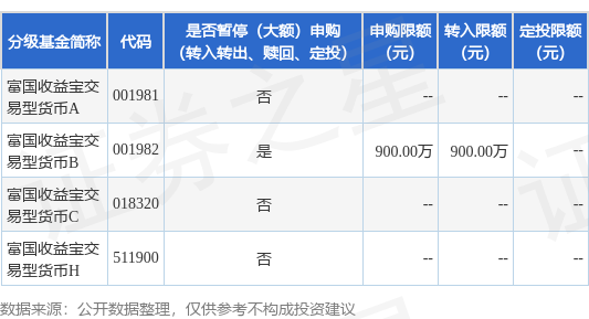 2、上表中限制相关业务的金额仅适用于本基金B类份额。本基金A类份额当日累计申购份额上限请参见本基金管理人于2023年6月21日发布的《关于富国收益宝交易型货币市场基金暂停大额申购、定期定额投资及转换转入业务的公告》的相关内容。本基金B类份额针对个人客户当日累计申购份额上限请参见本基金管理人于2024年8月19日发布的《关于富国收益宝交易型货币市场基金暂停大额申购、转换转入及定期定额投资业务的公告》的相关内容。本基金C类份额当日累计申购份额上限请参见本基金管理人于2023年4月17日发布的《关于富国收益宝交易型货币市场基金暂停大额申购、转换转入及定期定额投资业务的公告》的相关内容。