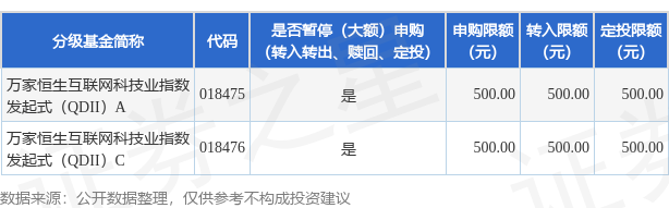 证券之星消息,12月19日万家基金管理有限公司发布《关于万家恒生互联网科技业指数型发起式证券投资基金(QDII)暂停大额申购(含转换转入、定期定额投资)业务的公告》。公告中提示,为了保证基金的平稳运作,保护基金份额持有人的利益,自2024年12月19日起万家恒生互联网科技业指数型发起式证券投资基金(QDII)暂停大额申购(含转换转入、定期定额投资)业务,申购、转换转入上限金额为0.05万元,下属分级基金调整明细如下: