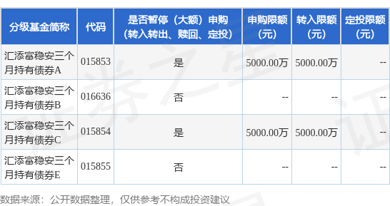 注:1、自2024年12月20日起(含2024年12月20日),汇添富稳安三个月持有债券A暂停大额申购、大额转换转入、大额定期定额投资业务,单日单个基金账户单笔或多笔累计申购、转换转入、定期定额投资的金额不应超过50000000人民币元(含50000000人民币元)。当单日某基金账户单笔或多笔累计申购、转换转入、定期定额投资该份额的金额超过50000000人民币元,本公司将部分或全部拒绝。该份额暂停上述大额业务期间,其他业务仍照常办理。自2024年12月25日起,本基金汇添富稳安三个月持有债券A将恢复办理大额申购、大额转换转入、大额定期定额投资业务,届时将不再另行公告。
