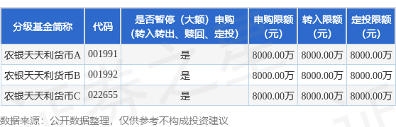 证券之星消息,12月24日农银汇理基金管理有限公司发布《关于农银汇理天天利货币市场基金调整大额申购、转换转入和定期定额投资限额的公告》。公告中提示,为了保证基金的平稳运作,保护基金份额持有人利益,自2024年12月24日起农银汇理天天利货币市场基金调整大额申购、转换转入和定期定额投资限额,申购、转换转入上限金额为8000.0万元,下属分级基金调整明细如下:
