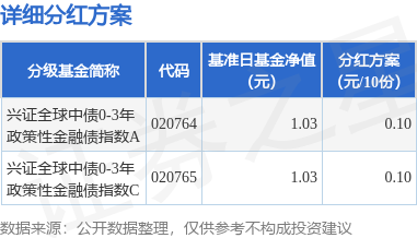 证券之星消息,12月24日发布《兴证全球中债0-3年政策性金融债指数证券投资基金分红公告》。2024年第1次。公告显示,本次分红的收益分配基准日为12月12日,详细分红方案如下: