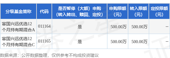 证券之星消息,12月26日富国基金管理有限公司发布《关于富国兴远优选12个月持有期混合型证券投资基金暂停大额申购、转换转入及定期定额投资业务的公告》。公告中提示,为了保证基金的平稳运作,保护基金持有人的利益,自2024年12月27日起富国兴远优选12个月持有期混合型证券投资基金暂停大额申购、转换转入及定期定额投资业务,下属分级基金调整明细如下:
